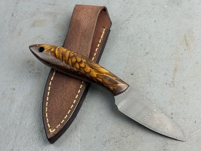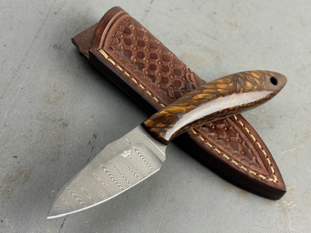 Klingenlänge : 64mm Klingenstärke : 2,5mm Gesamtlänge : 160mm Griffmaterial : Juma Snake Wird mit der abgebildeten Lederscheide geliefert