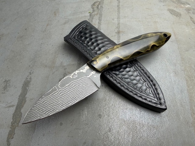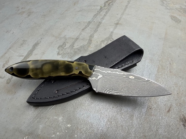Stahl : Schanz Schneider Damast HRC : 60 Klingenlänge : 80mm Klingenstärke : 3,2mm Gesamtlänge : 190mm Griffmaterial : Raffir Moon Wird mit der abgebildeten Lederscheide geliefert