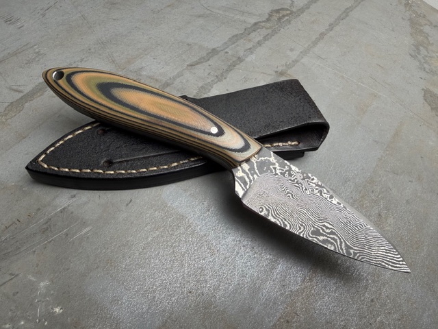 Stahl : Schanz Schneider Damast HRC : 61 Klingenlänge : 80mm Klingenstärke : 3,2mm Gesamtlänge : 190mm Griffmaterial : Suretouch Wird mit der abgebildeten Lederscheide geliefert