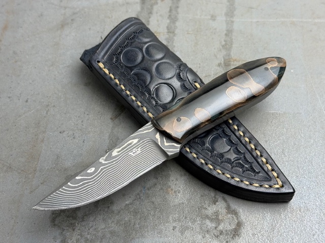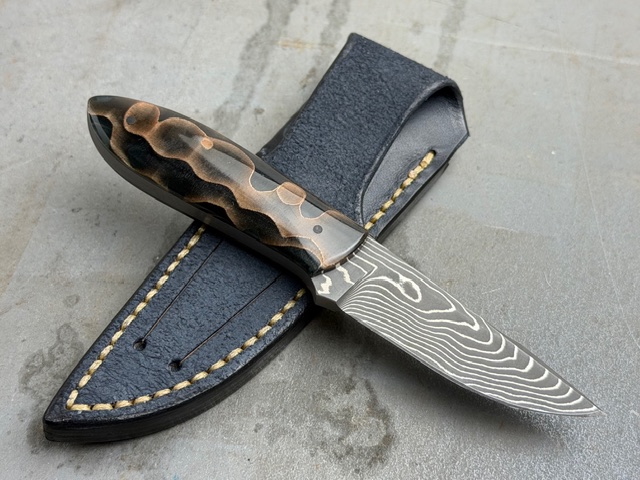 Stahl : Schanz Schneider Damast HRC : 60 Klingenlänge : 60mm Klingenstärke : 5mm Gesamtlänge : 130mm Griffschalen aus Raffir Wasp Wird mit der abgebildeten Lederscheide geliefert