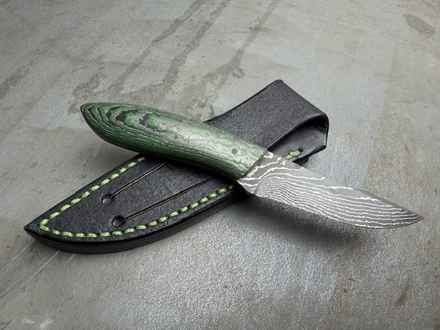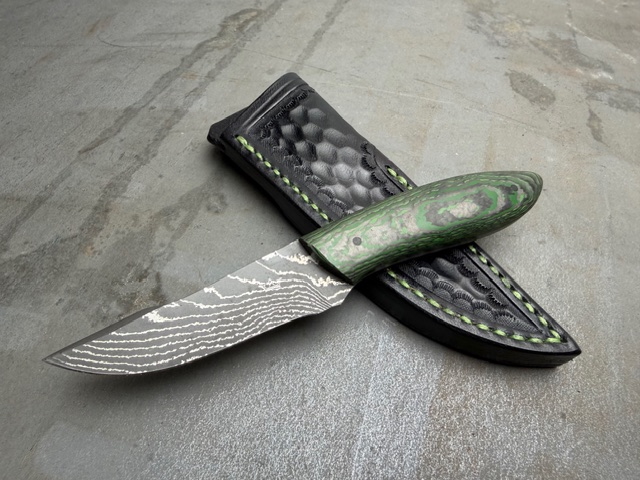 Stahl : Schanz Schneider Damast HRC : 60 Klingenlänge : 55mm Klingenstärke : 2mm Gesamtlänge : 127mm Griffschalen aus Fatcarbon Wird mit der abgebildeten Lederscheide geliefert