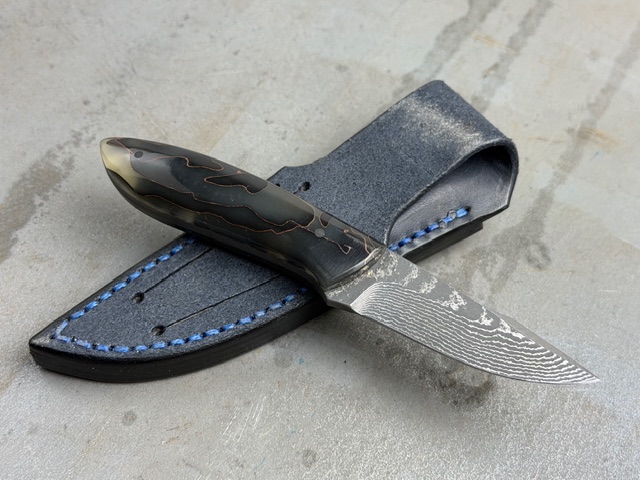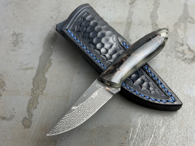 Stahl : Schanz Schneider Damast HRC : 60 Klingenlänge : 55mm Klingenstärke : 3mm Gesamtlänge : 127mm Griffschalen aus Raffir Glow Wird mit der abgebildeten Lederscheide geliefert