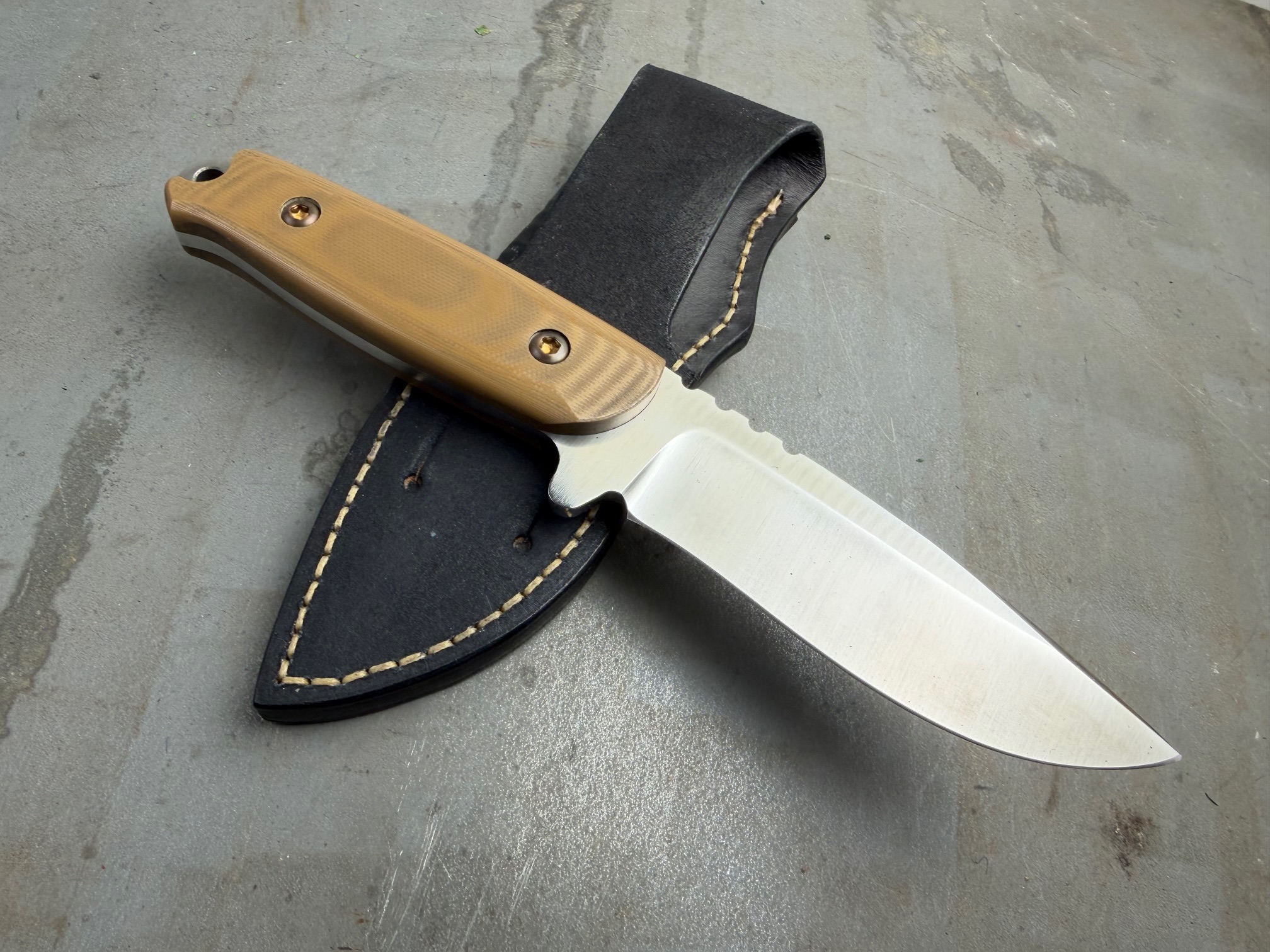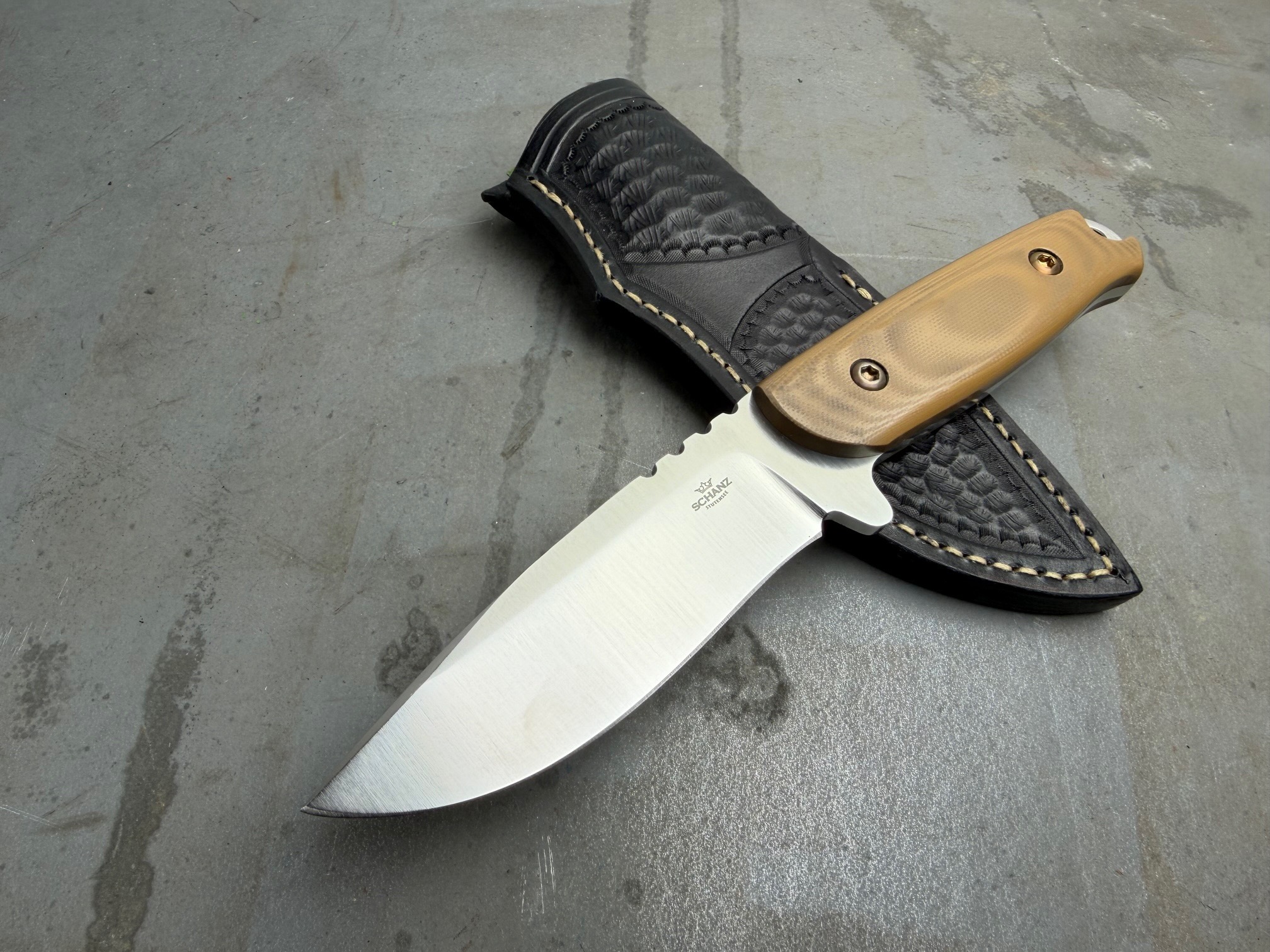 Ausgeliefert wird das Messer mit einer perfekt angepassten Lederscheide welche ein tragen am Gürtel in 2 Positionen ermöglicht.