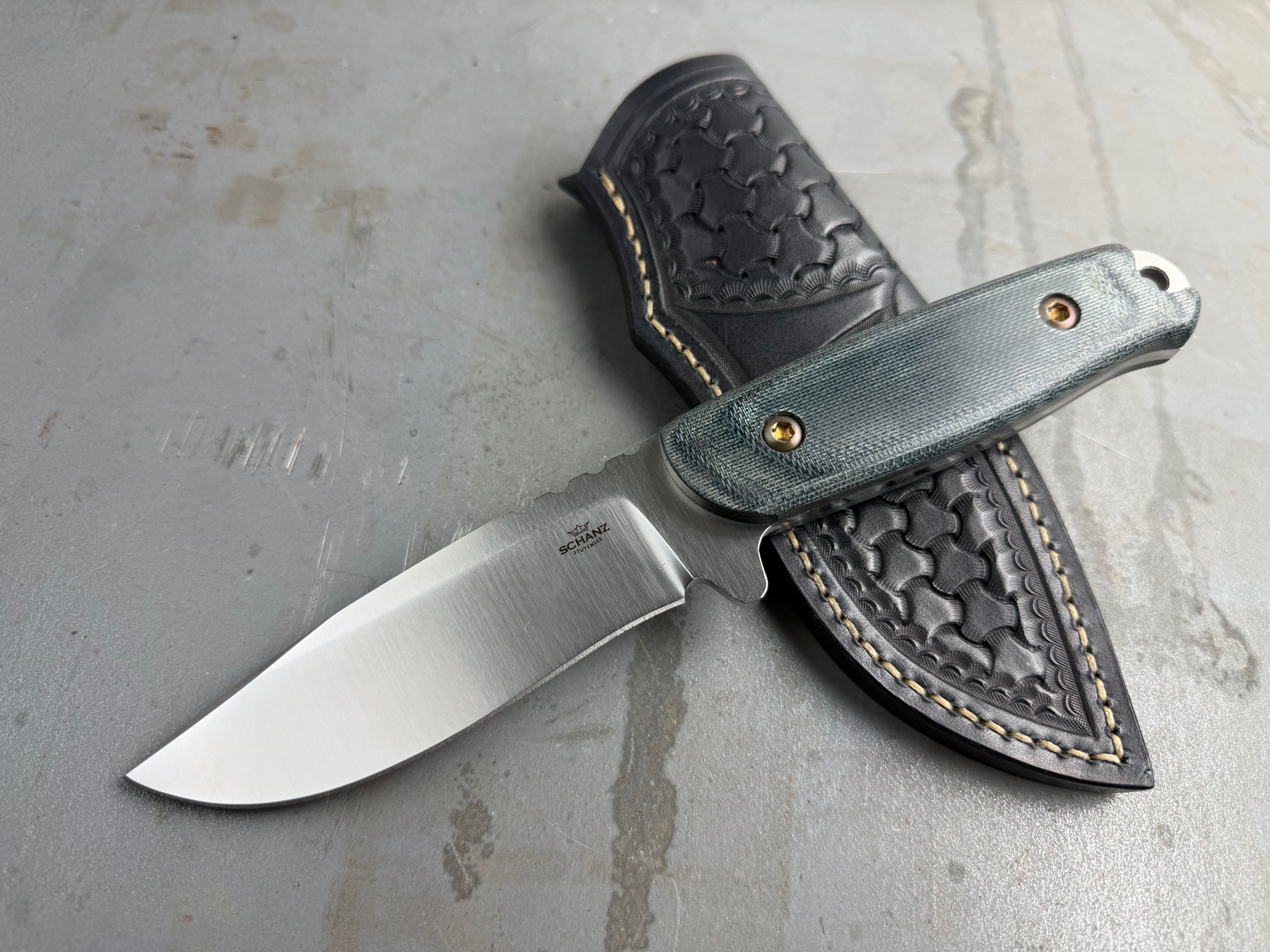 Ausgeliefert wird das Messer mit einer perfekt angepassten Lederscheide welche ein tragen am Gürtel in 2 Positionen ermöglicht.