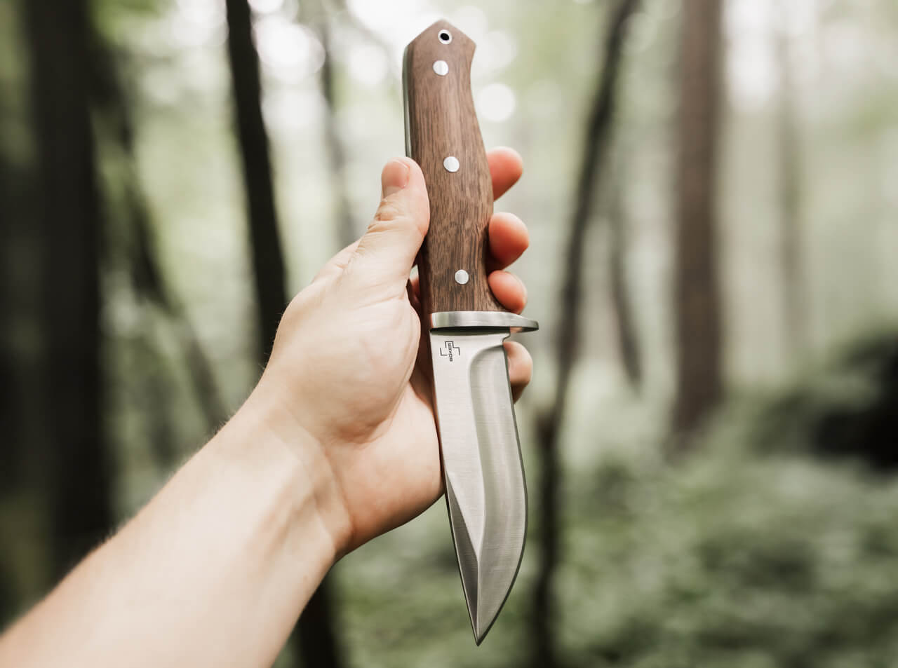 Für einen sicheren, ergonomischen Halt sorgt der Griff aus edlem Walnussholz, während der Vollerl und das Parrierelement zusätzliche Stabilität und Arbeitssicherheit gewährleisten. Dekorative Akzente setzen die drei Nieten im Griff sowie die markante Fehlschärfe am Klingenrücken. Die Hohlniete am Ende des Griffs kann als praktische Fangriemenöse verwendet werden, um das Messer sicher zu befestigen und bei Bedarf griffbereit zu halten.
